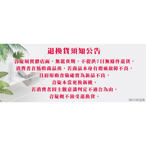 音旋屬實體店面,無鑑賞期,不提供7日無條件退貨,消費者在點收商品後,若商品本身有瑕疵故障不良,且經原廠查驗確實為新品不良,音旋本當更換新機,若消費者因主觀意識判定不適合為由,音旋概不接受退換貨。